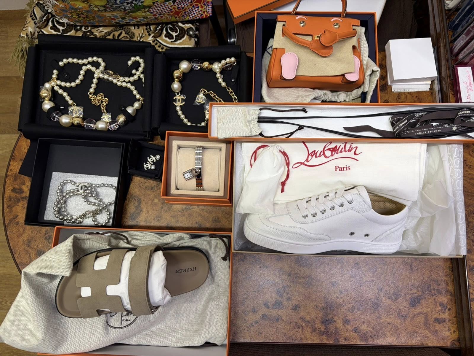 Серед знайдених товарів — жіноча сумка та годинник торгової марки HERMES, шльопанці HERMES, кросівки Christian Louboutin, сережки, два намиста та браслет торгової марки CHANEL.