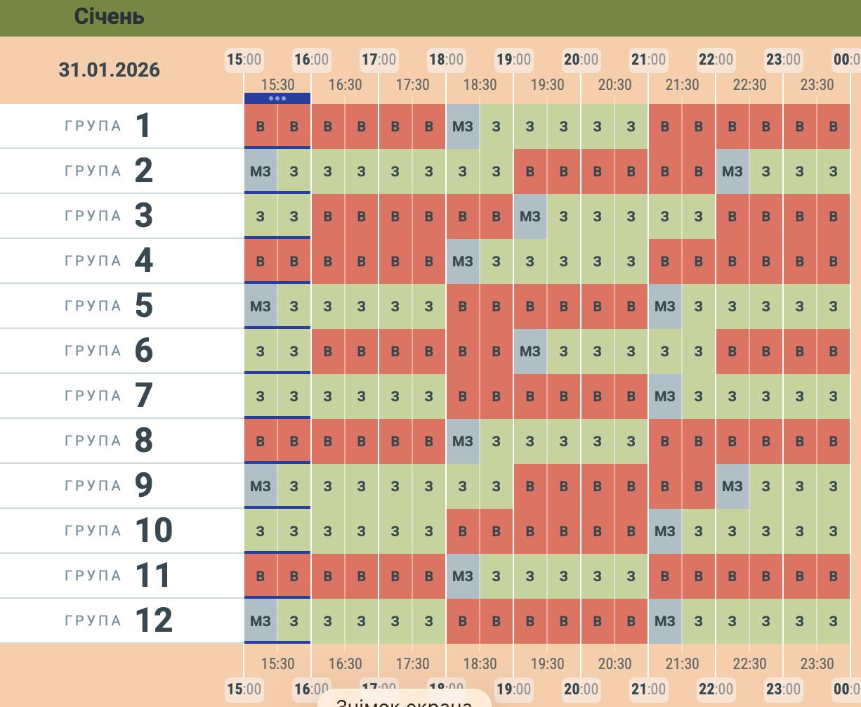 ⚡️ Орієнтовний графік заживлення для груп споживачів • 31.01.2026
