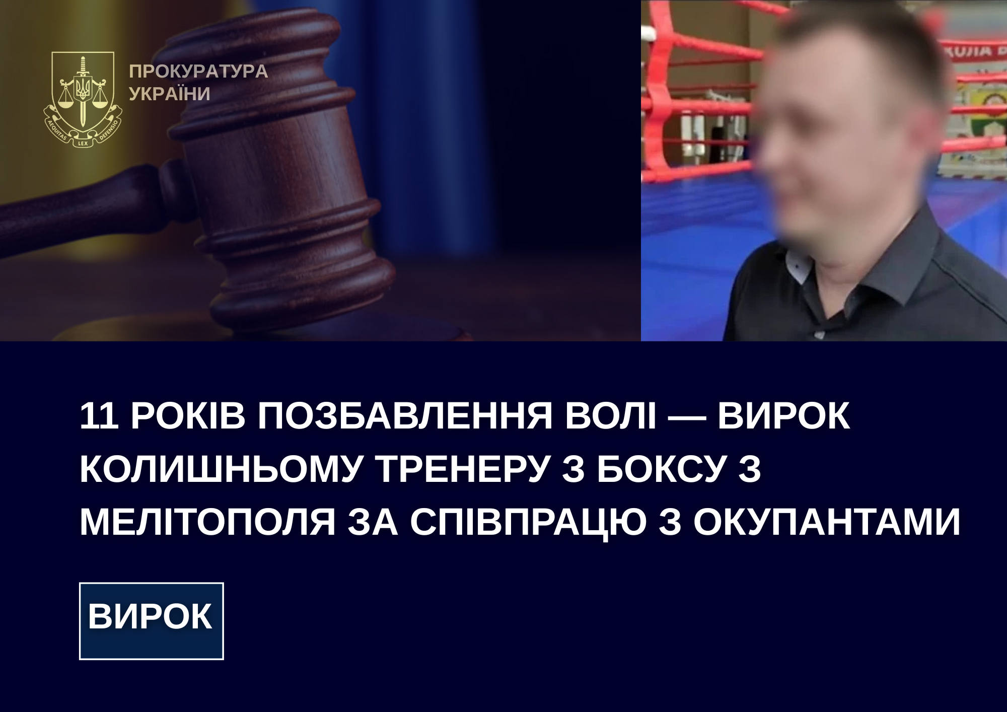 За публічного обвинувачення ювенальних прокурорів Чернівецької обласної прокуратури 39-річного жителя Мелітополя, який до тимчасової окупації міста працював тренером з боксу у спортивній школі, визнано винним у колабораційній діяльності та пособництві державі-агресору (ч. 5 ст. 111-1, ч. 1 ст. 111-2 КК України).