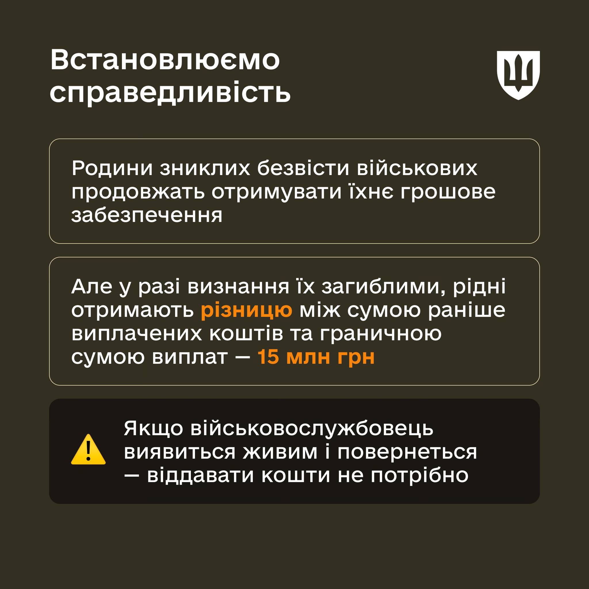 Згідно з новими правилами, родини зниклих безвісти продовжать отримувати грошове забезпечення військовослужбовця. У разі підтвердження загибелі їм буде виплачено різницю між уже отриманими коштами та встановленою сумою у 15 млн гривень.