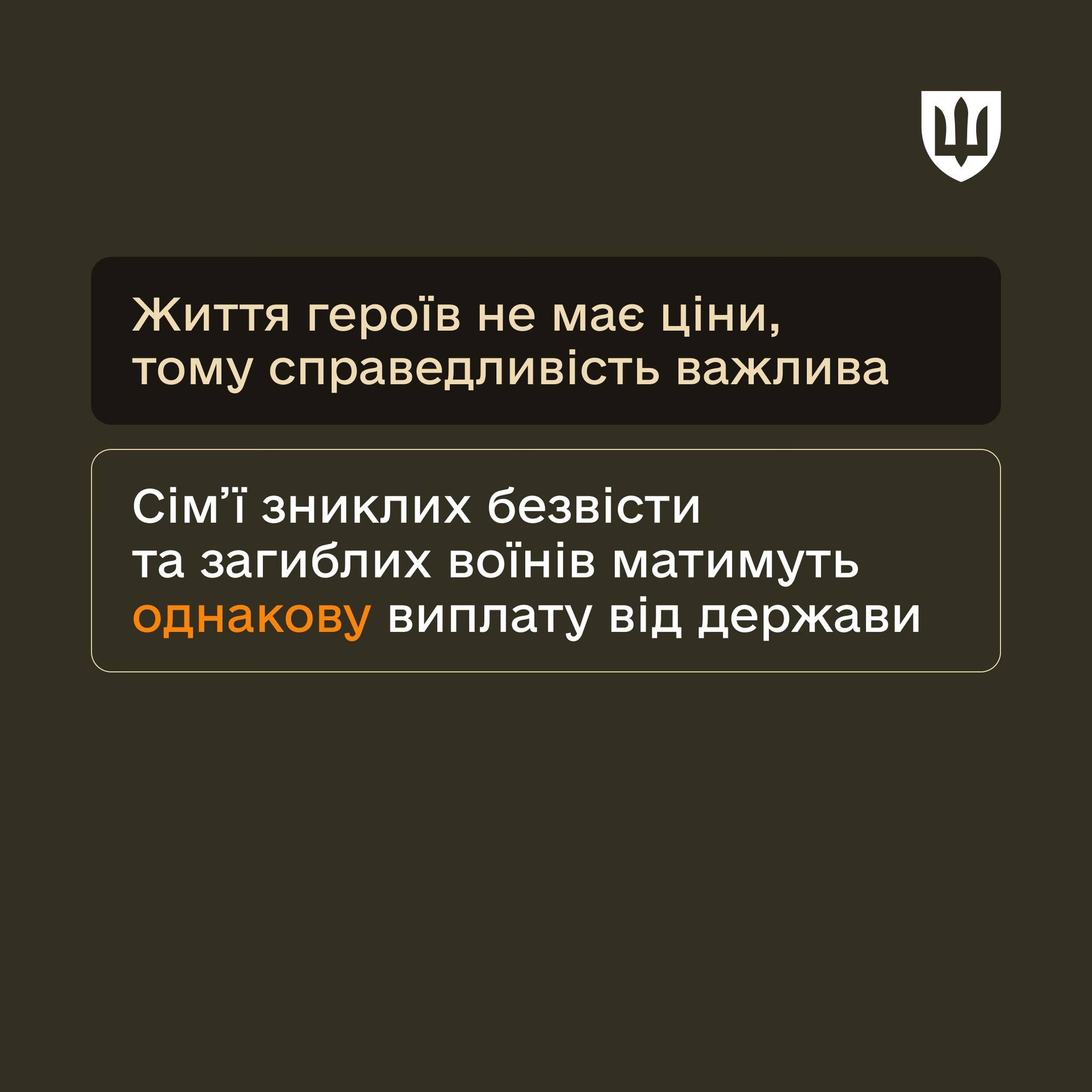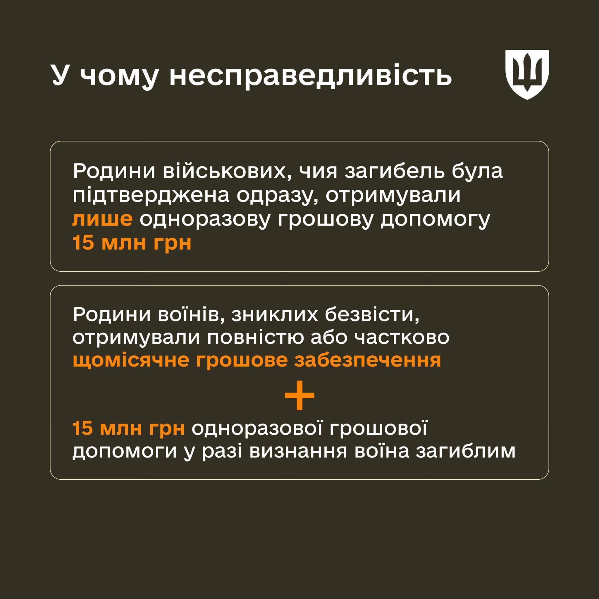 Раніше у випадку, коли військовослужбовцю надавали статус зниклого безвісти, його родина отримувала щомісячне грошове забезпечення. Якщо згодом факт загибелі підтверджувався, додатково призначалася одноразова допомога у розмірі 15 млн грн. Водночас сім’ї військових, чию загибель встановлювали одразу, отримували лише одноразову виплату.