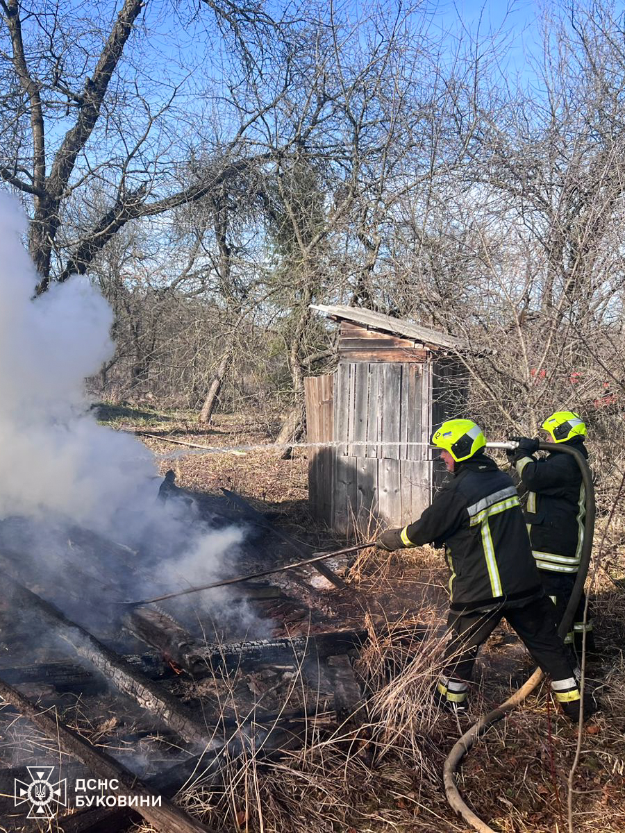 У селі Давидівка Сторожинецької громади Чернівецького району виникла пожежа в господарській будівлі. Вогонь поширився на прилеглу територію, де зайнялася суха трава. Рятувальники разом із місцевими пожежними командами ліквідували загоряння на площі 60 квадратних метрів. Вогнем знищено господарську будівлю та пошкоджено житловий будинок. Причину пожежі встановлюють фахівці.