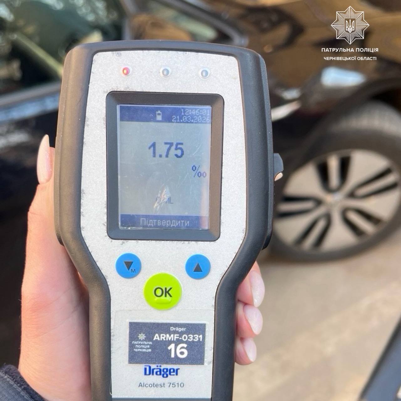 Результат тесту склав 1,75 проміле, що значно перевищує допустиму норму.