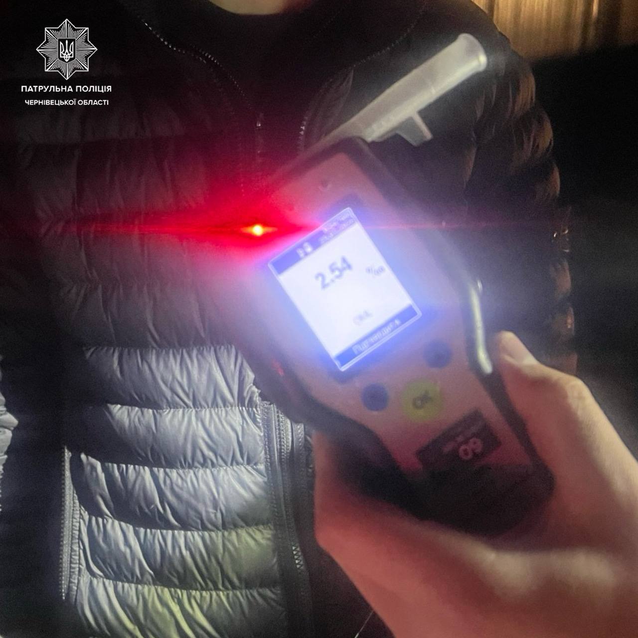 Під час спілкування з керманичем інспектори помітили характерні ознаки алкогольного сп’яніння. Водій погодився пройти огляд на місці зупинки. Результат тесту склав 2,54 проміле, що більш ніж у 12 разів перевищує допустиму норму.