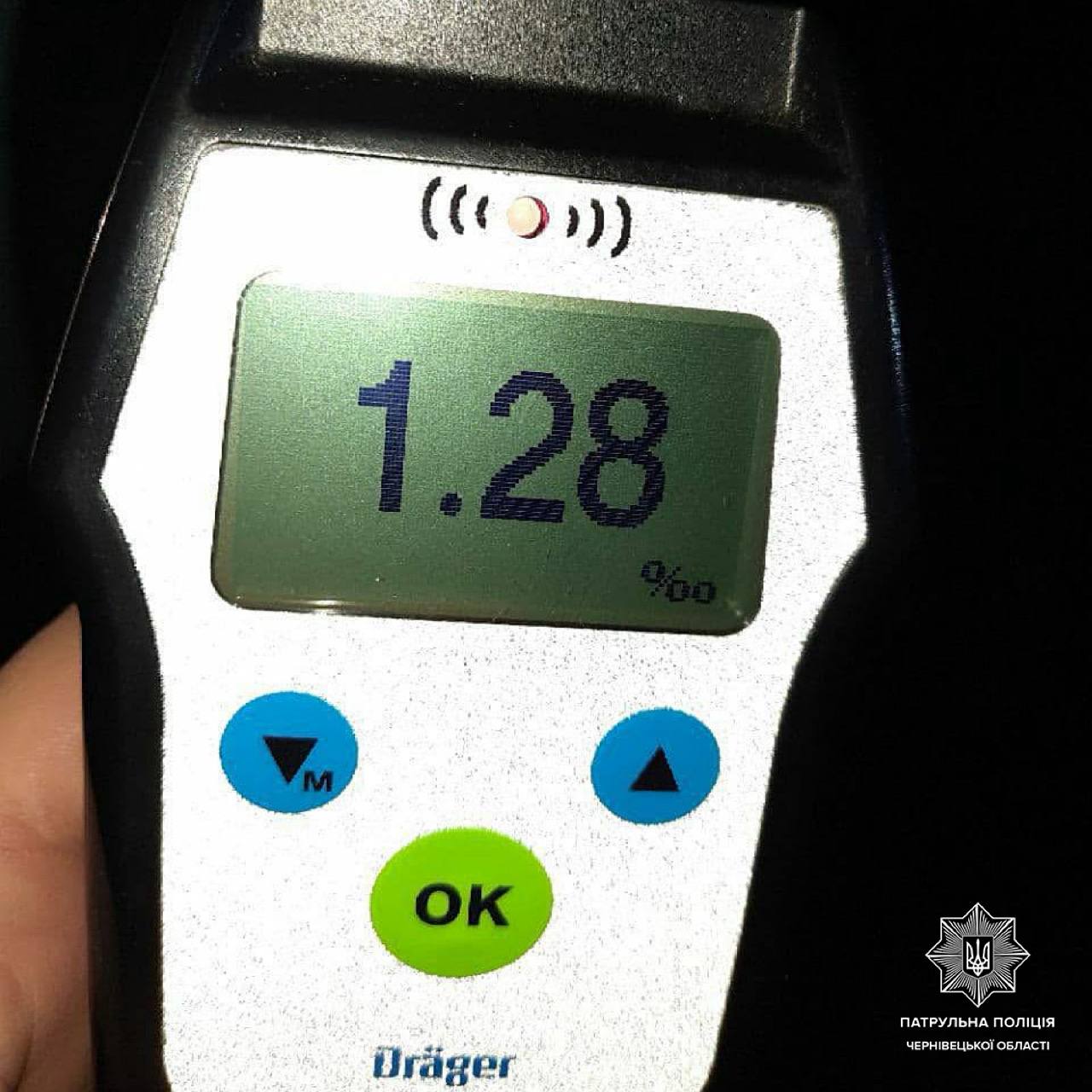 Під час спілкування з керманичем інспектори помітили ознаки алкогольного сп’яніння. Чоловік погодився пройти огляд на місці зупинки, результат якого склав 1,28 проміле.
