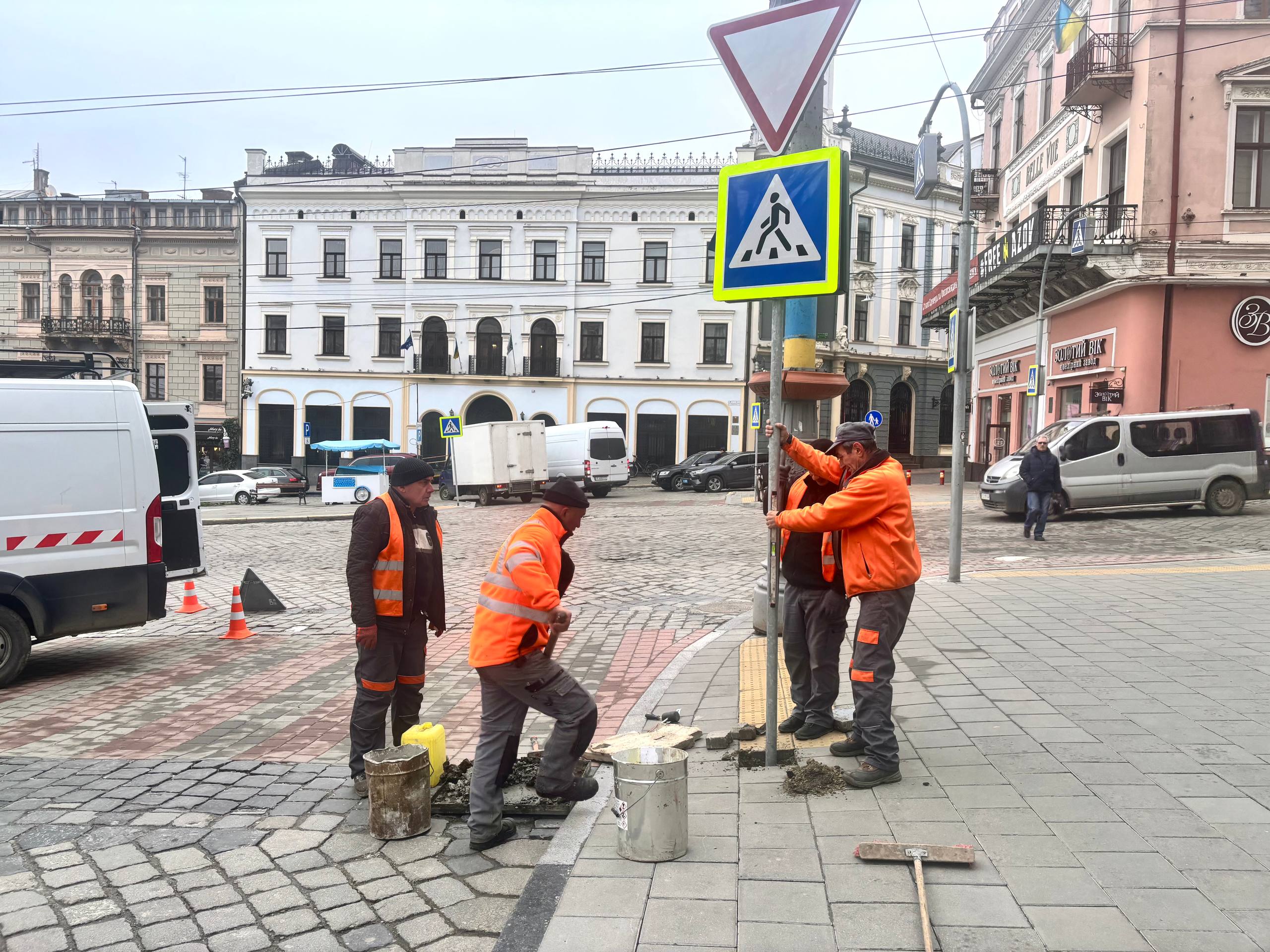 У Чернівцях на Центральній площі, 1 тривають роботи з оновлення організації дорожнього руху перед ратушею.