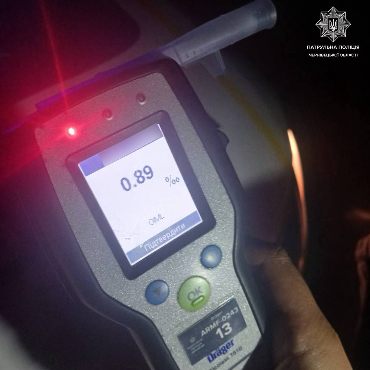 Під час спілкування з водієм інспектори виявили у нього ознаки алкогольного сп’яніння. Чоловік погодився пройти огляд на місці зупинки. Результат тесту — 0,89 проміле алкоголю.