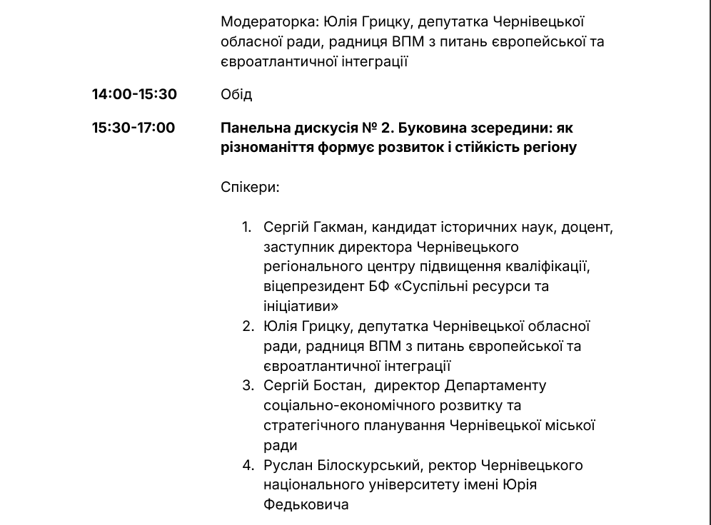 Очікується участь представників влади, дипломатичного корпусу, експертного середовища та громадського сектору. Серед спікерів — Павло Клімкін, Євген Глібовицький, Генеральний консул Румунії у Чернівцях Ірина-Лоредана Стенкулєску, Анжела Грамада, Пауль Пшенічка та Олександр Бойченко.